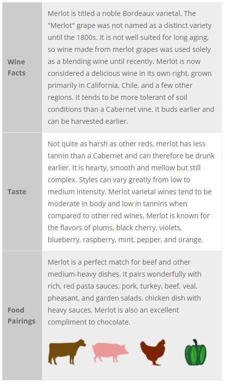 Originating in France’s Bordeaux region in the first century, the grape is also grown in the United States, Chile, Italy, Europe, Australia, Canada, New Zealand, and South Africa. Merlot is the name of a red grape which traces its ancestry to the biturica variety. Many of today’s wines originated from the merlot grape such as Cabernet and Malbec. Merlot was used to mix with Cabernet in French Bordeaux wines with the primary intent to soften and balance.