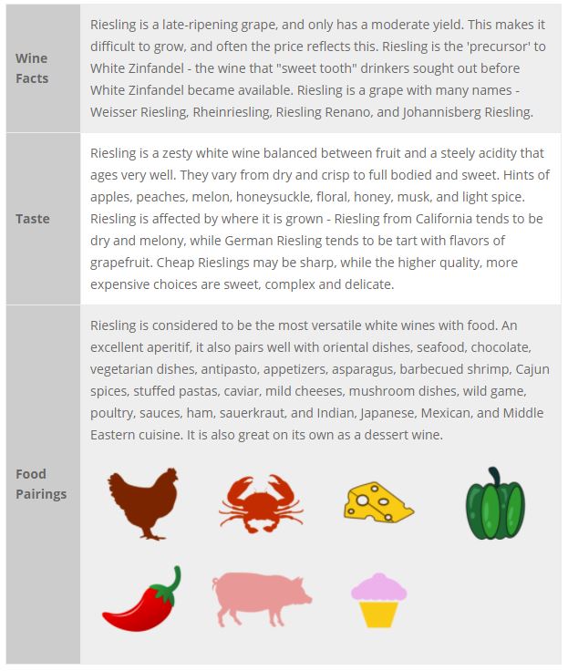 The Riesling grape is believed to be indigenous to Germany, and has been planted there since the 14th century. Riesling is the most planted grape in the Rhine Valley in Germany, and people who talk about a “Rhine Wine” are talking about a Riesling. Riesling does the best in Germany and in California, but is also grown in the Alsace region of France, in Austria, Australia, Canada and New Zealand.