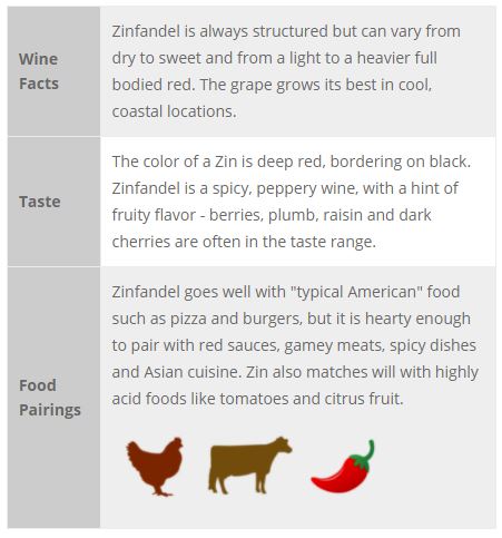Red Zinfandel is an “American Classic” wine – it was even originally thought to be made of native Californian grapes. Research has now shown that the Zinfandel grape originated in Italy, but this wine is still mostly grown in California.