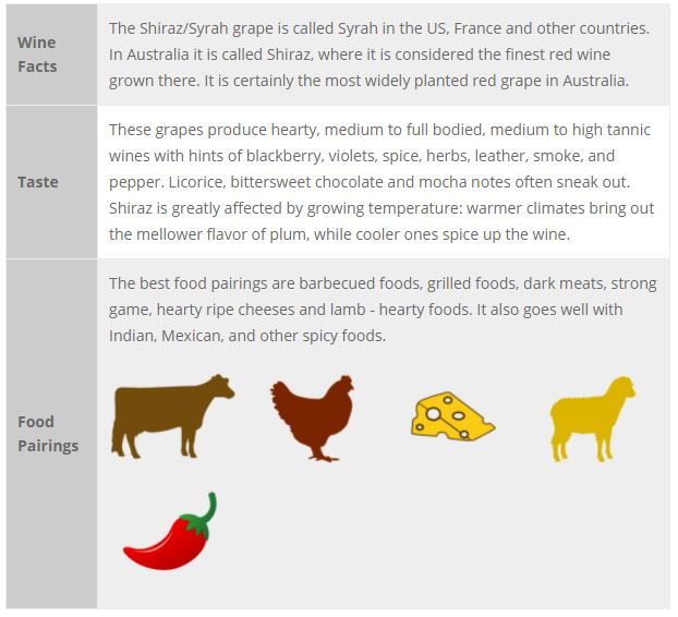 The Shiraz grape was once thought to have originated in Persia, but recent research indicates the grape is a native of the Rhone valley, in France. It is best known for its usage in Hermitage, in the Rhone valley.